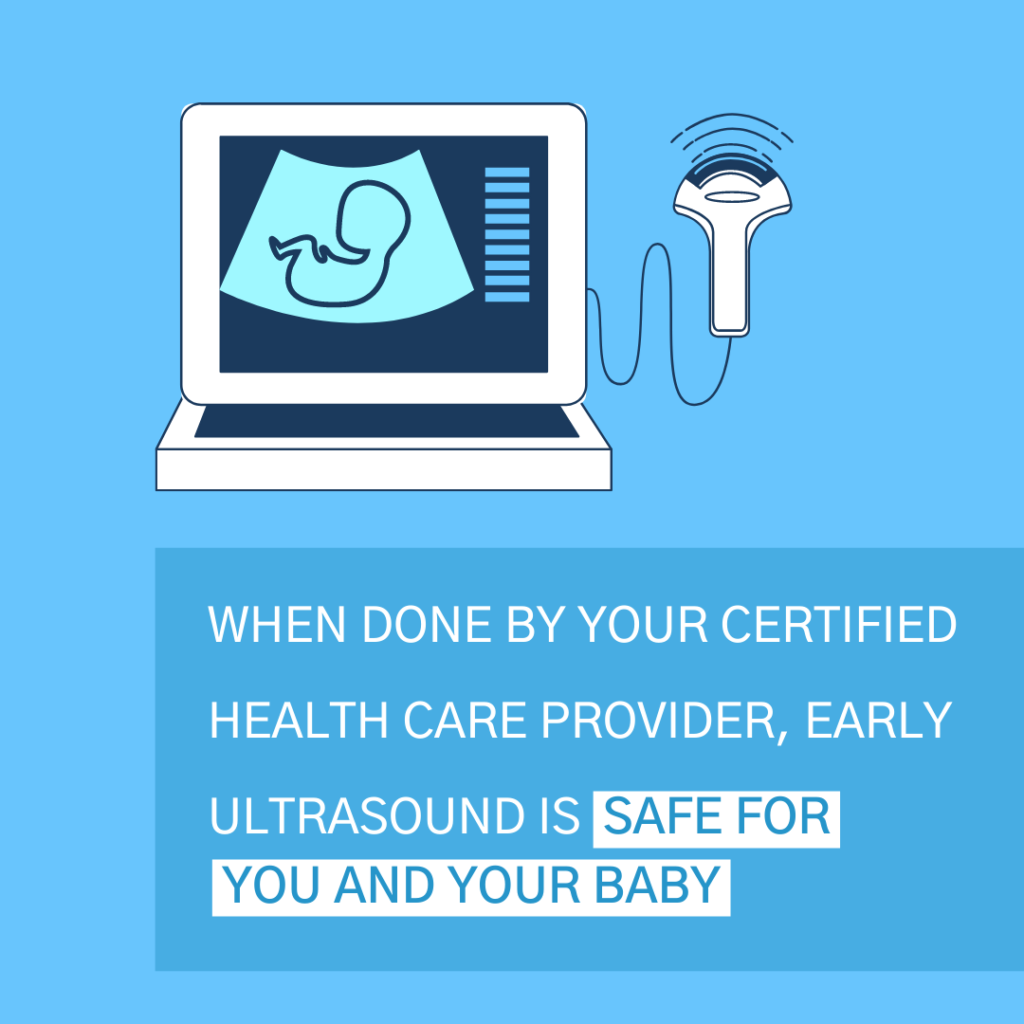 Early ultrasounds are are non-invasive, medical diagnostic procedures. An ultrasound machine is safe when used by a certified health care provider. If you schedule a prenatal ultrasound with us, you and your baby will be free of any dangerous risks. (2)