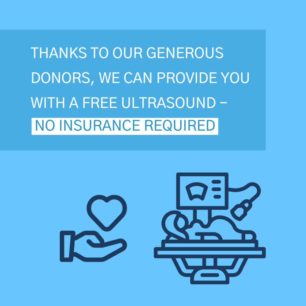 Thanks to our generous donors, we are able to provide you with a free ultrasound. You do not need insurance. We provide this as a service to you and your unborn baby. Our pregnancy center is a nonprofit organization, and we are here to support you. We keep your information completely confidential and do not profit from any decision you make. For more information about pregnancy centers, click here. (1)