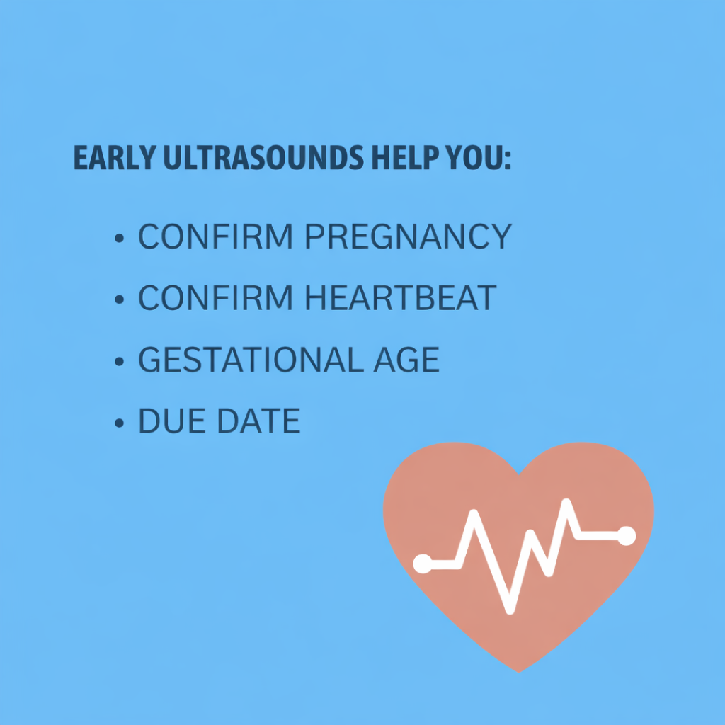 One of the most common reasons for an early ultrasound is to confirm pregnancy, which your doctor can also confirm with a blood test. Other reasons include: checking location of pregnancy (in the uterus), finding the heartbeat, determining gestational age for dating purposes. Gestational age estimates the weeks of gestation to determine your baby’s due date.